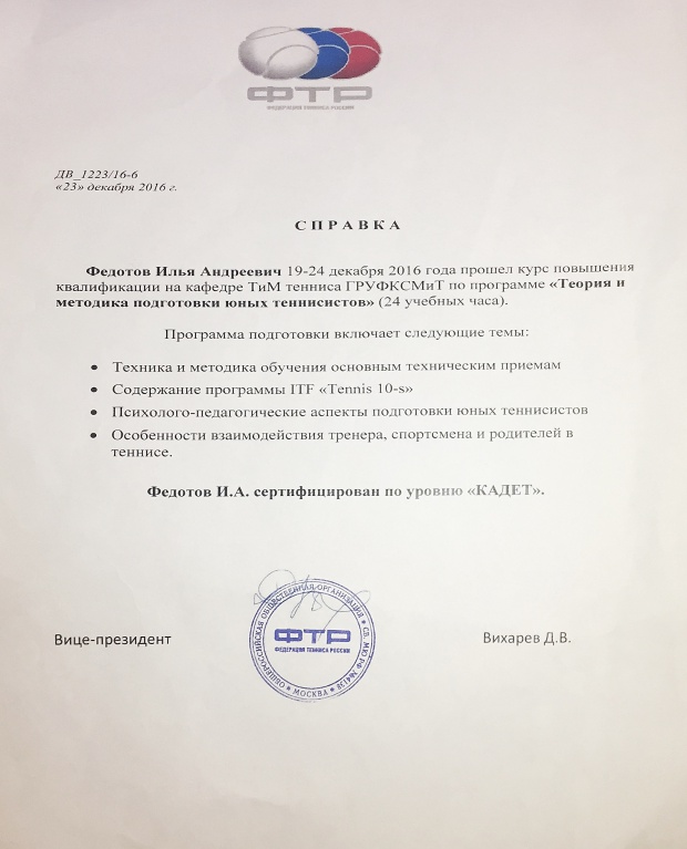 Декабрь 2016 г прошел курс повышения квалификации ГРУФКСМиТ по программе “Теория и методика подготовки юных теннисистов” категория КАДЕТ