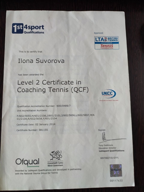 Начала играть с 5 лет. Закончила спортивную школу в Эстонии. Обучалась в теннисной академии в Чехии 3года, город Писек. Участвовала в теннисных турнирах, Tennis Europe, ITF. Закончила Университет Бирмингем, Англия, 4 года (бакалавр) факультет Спортивный Менеджмент. Имею Английскую Категорию тренера по теннису LTA, Европейскую категорию тренера ITF. Имеется опыт работы в теннисной академии в Германии, Штутгарт First -line, Детская Теннисная Академия во Всеволожске, также работала в теннисных клубах, Edgbaston Priory в Англии, теннисный клуб Kadriorg в Эстонии